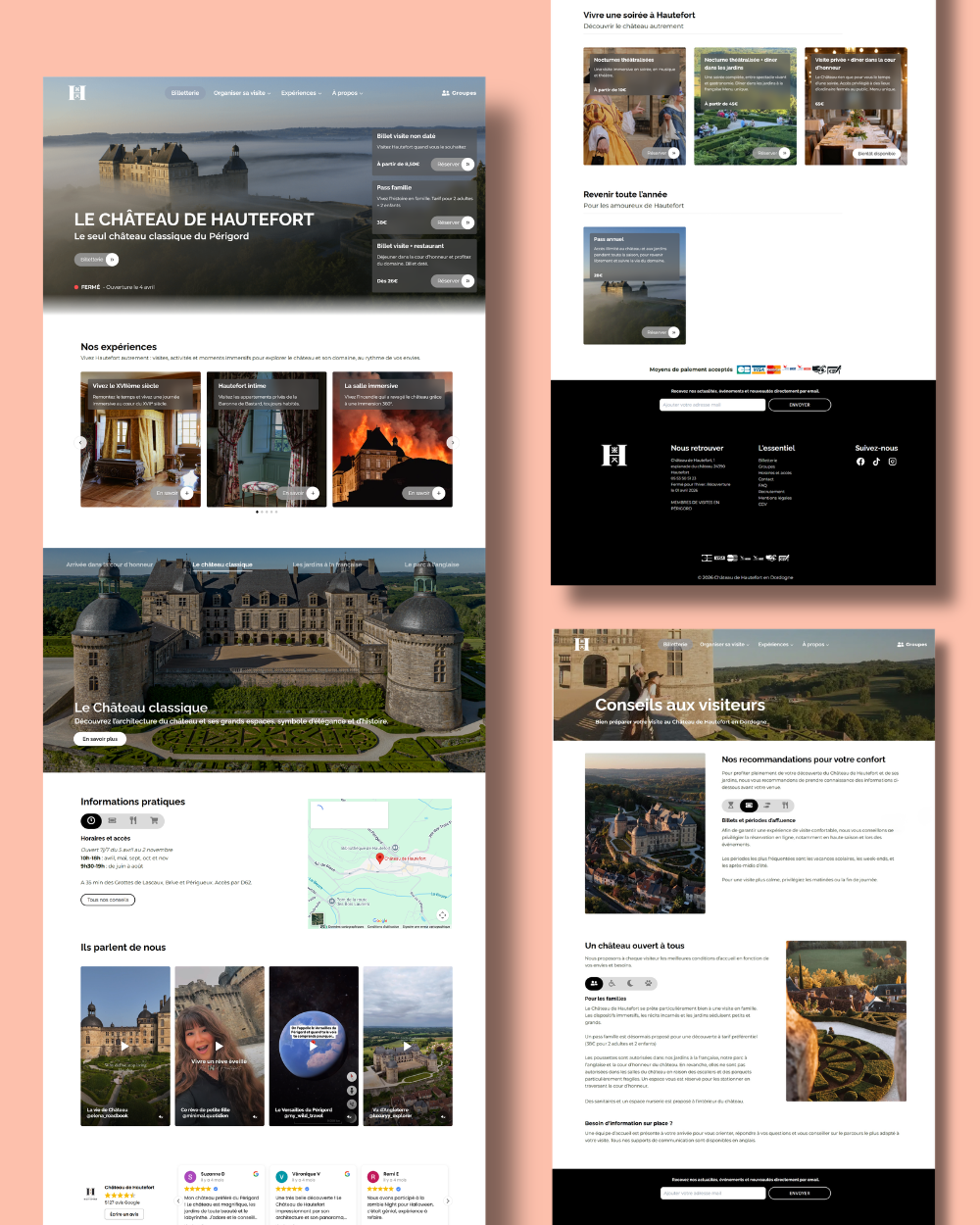 Pour le Château de Hautefort, site emblématique du Périgord, j’ai réalisé la refonte complète de son site WordPress afin de moderniser l’expérience utilisateur et d’optimiser le tunnel de conversion. L’objectif : passer d’un site principalement informatif à une plateforme plus orientée vente, mettant davantage en avant la billetterie, les expériences et les temps forts du domaine.